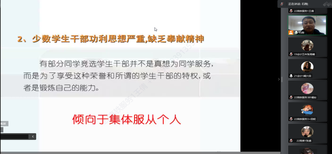 培训会上,石刚老师以诙谐幽默的语言,结合同学们身边的实际案例,采用讲述与提问相结合的方式从公司班团干部的基本状况、班团干部对一个班集体的重要性、班团干部可能存在的普遍问题、班团干部应坚持的工作原则以及作为班团干部如何提升自己的素质能力和服务水平等方面展开。