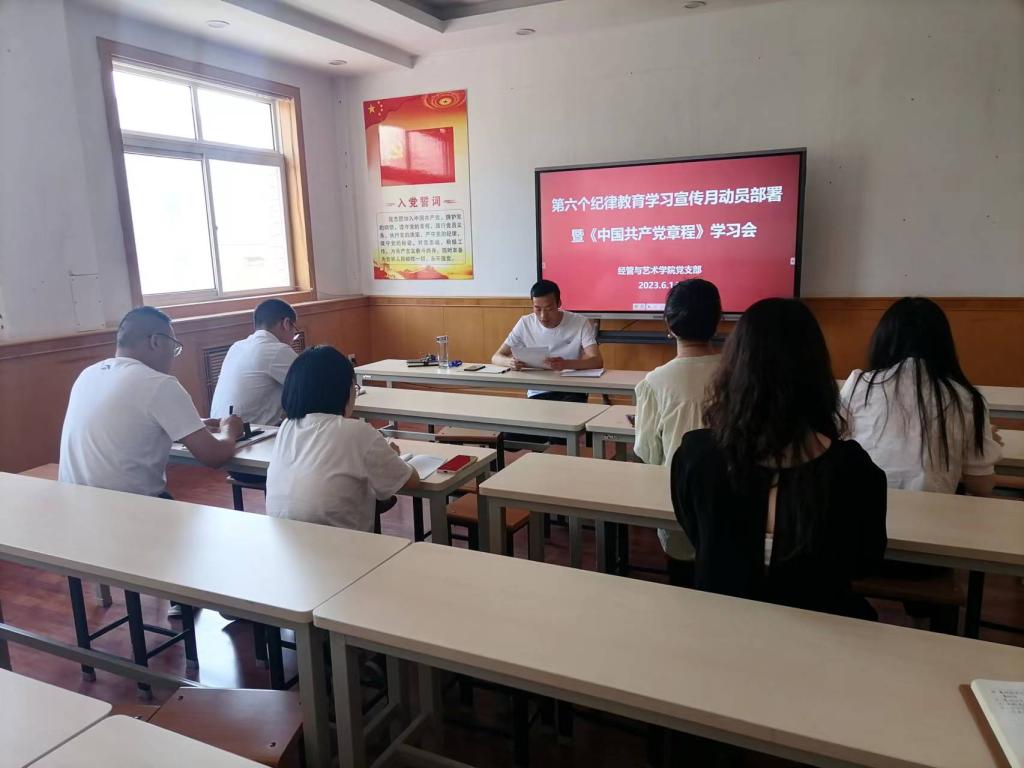 为庆祝中国共产党成立102周年,深入贯彻落实党的二十大精神,6月14日下午,经管与艺术公司党支部在经管建筑二楼会议室开展第六个纪律教育宣传月动员部署暨集体学习会。会议由支部书记孟发军主持,全体党员参加。