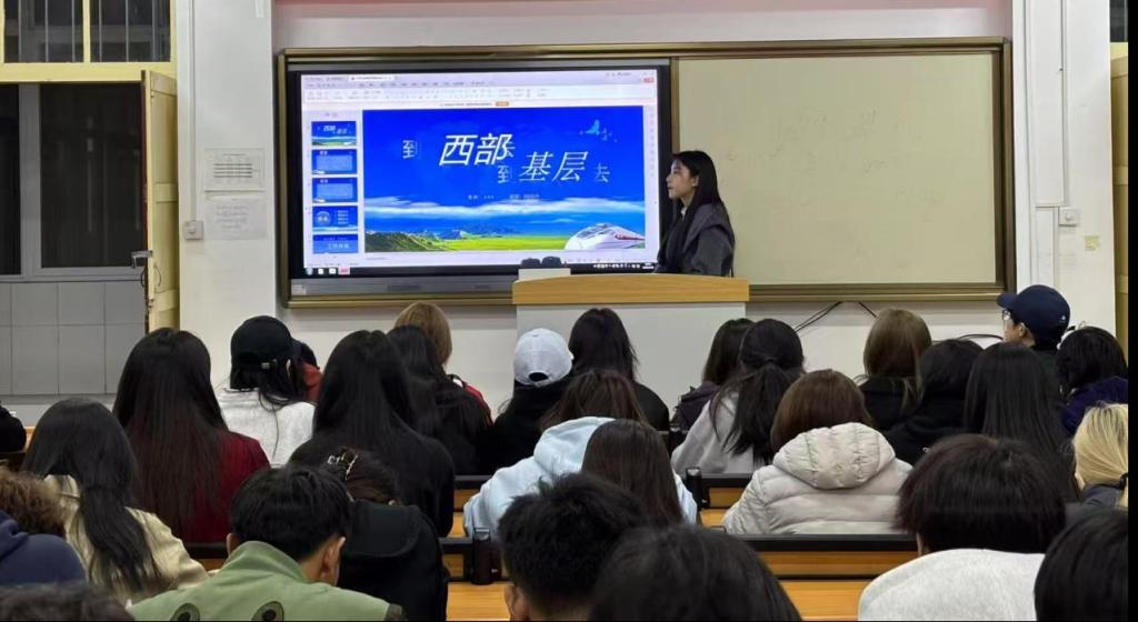 部分班级通过网上查找参与西部计划员工的经历分享,让员工进一步了解西部计划。王同学在视频中动情说道:“在新疆基层服务的两年,我参与了乡村教育数字化改革项目,真切感受到西部发展的蓬勃生机。这段经历不仅让我收获了成长,更坚定了服务国家的信念。”真实的成长故事引发了同学们的强烈共鸣。
