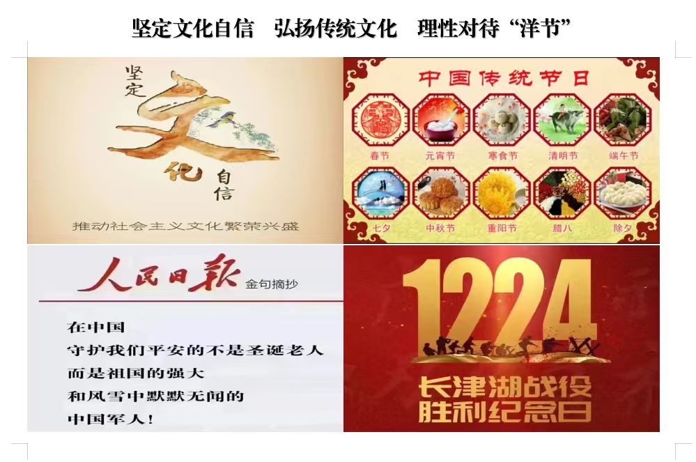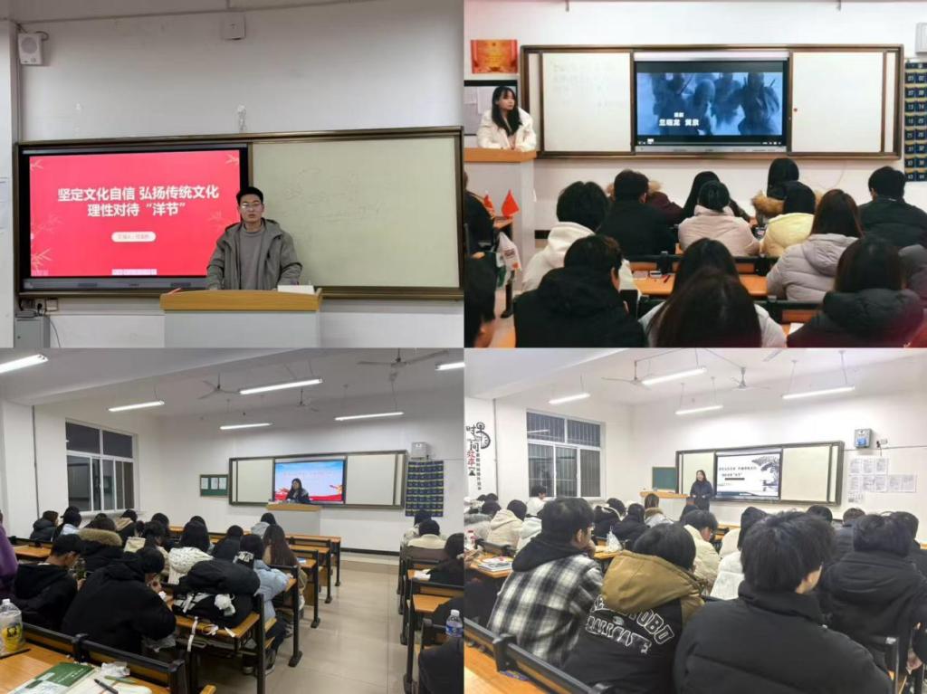 为进一步引导青年学子厚植家国情怀,筑牢民族文化根基,树立正确的文化认知导向。12月21日晚,bevitor伟德国际1946组织各班级召开“坚定文化自信 弘扬传统文化 理性对待‘洋节’”主题班会。各班积极响应,结合班级特色策划开展了形式多样的活动,或分享传统节日典故,或组织传统习俗体验,让同学们在互动中加深 对中华传统文化的理解与认同。