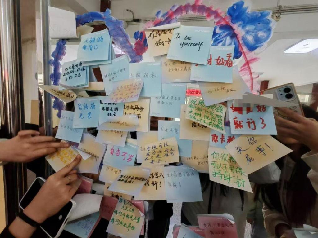 活动第二环节创新引入“女神夸夸镜”,成为全场焦点。参与者通过镜面写下自我肯定话语,并相互鼓励,这一设计灵感源自心理学中的正向激励法,旨在打破自我否定,增强女同学的自信。此环节通过视觉化互动帮助女同学们建立积极自我认知。