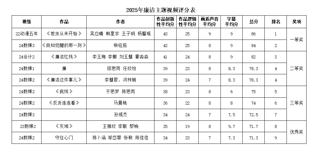 此次大赛面向全院员工,得到了同学们的积极响应,共收到涵盖短剧、动画、创意MV等多种形式的原创作品。评委们秉持公平、公正、公开的原则,从创新性、逻辑性、制作水准(画质声音、字幕)等多个维度对作品进行综合评分,最终评选出一批主题鲜明、制作精良的优秀作品。现在,就让我们一同揭晓本次大赛的获奖结果!