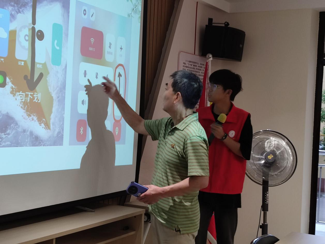 活动现场气氛热烈。在指导教师的带领下,志愿者们围绕老年人日常生活需求,耐心细致地讲解了智能手机的基本操作、抖音使用与简单视频剪辑、防范网络诈骗、线上就医与网购、智慧出行等多个实用模块。志愿者们采用“PPT全体授课”和“一对一”的教学方式,老人们学习热情高涨,积极互动、踊跃提问,课堂氛围活跃融洽。